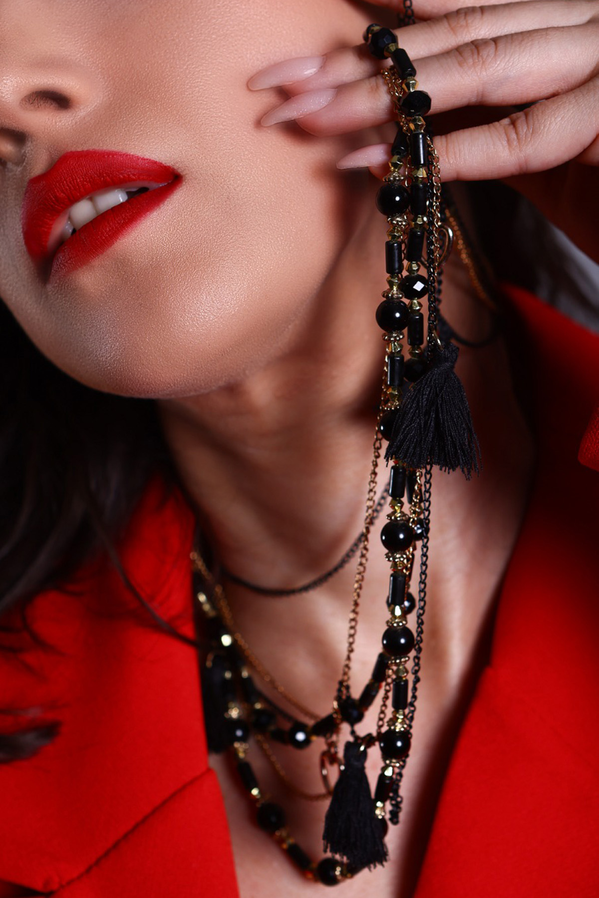 Siyah Boncuk Detaylı Püskül Uçlu Çok Katlı Kadın Kolye