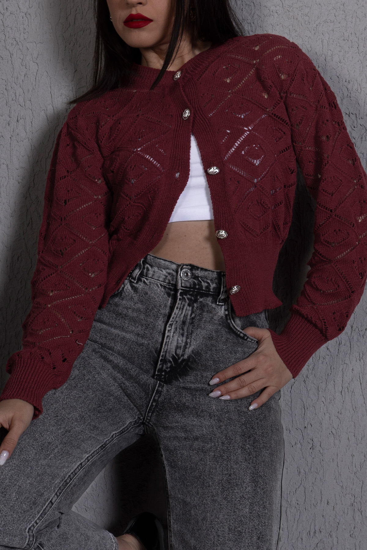 Kısa Kol Ajurlu Düğmeli Triko Hırka Beyaz