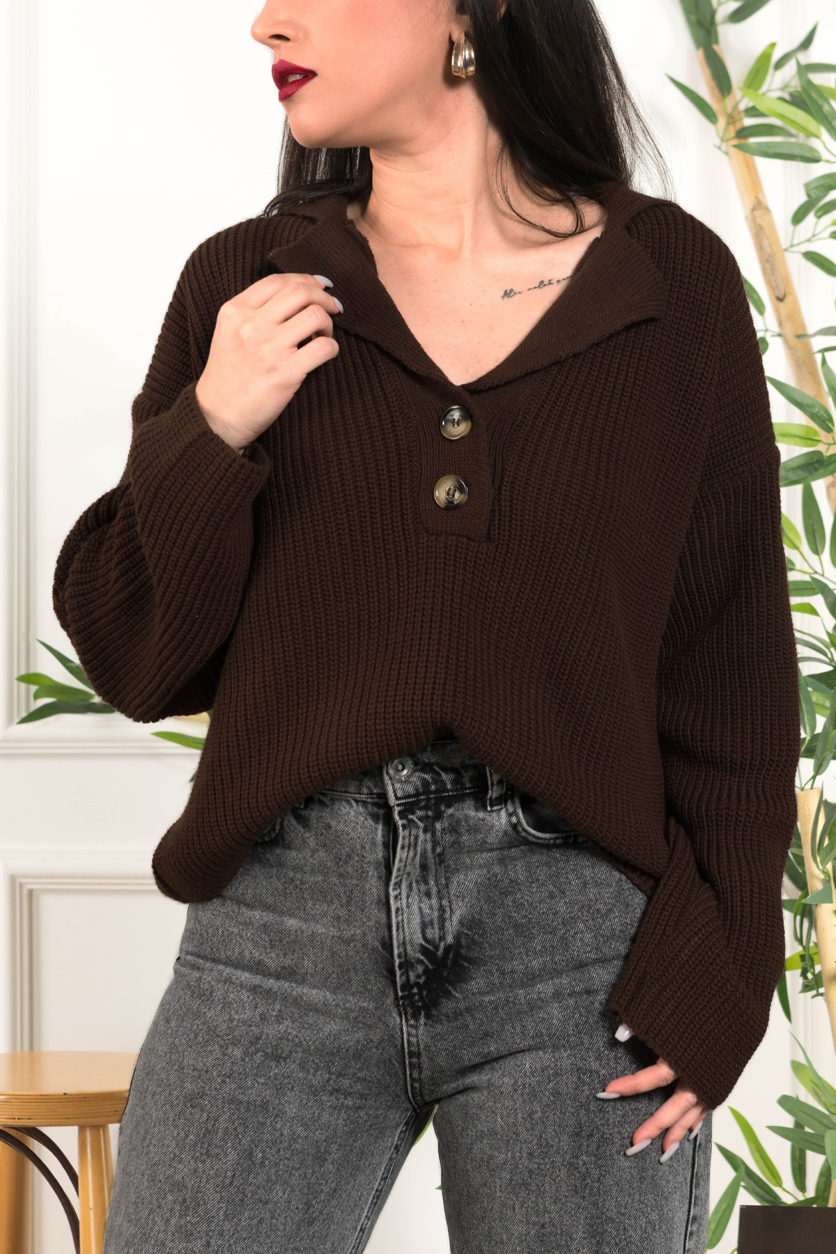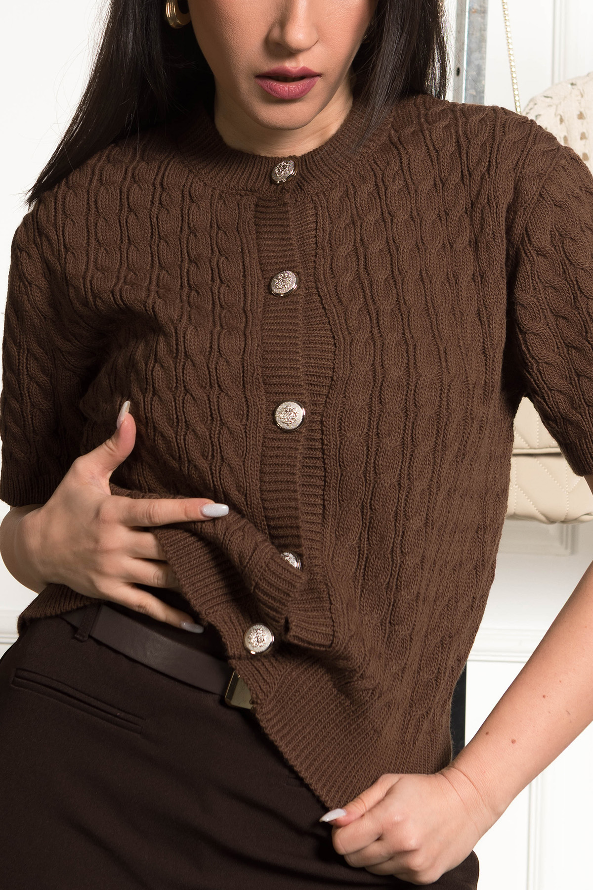 Kısa Kol Düğmeli Saç Örgü Triko Hırka – Kahverengi