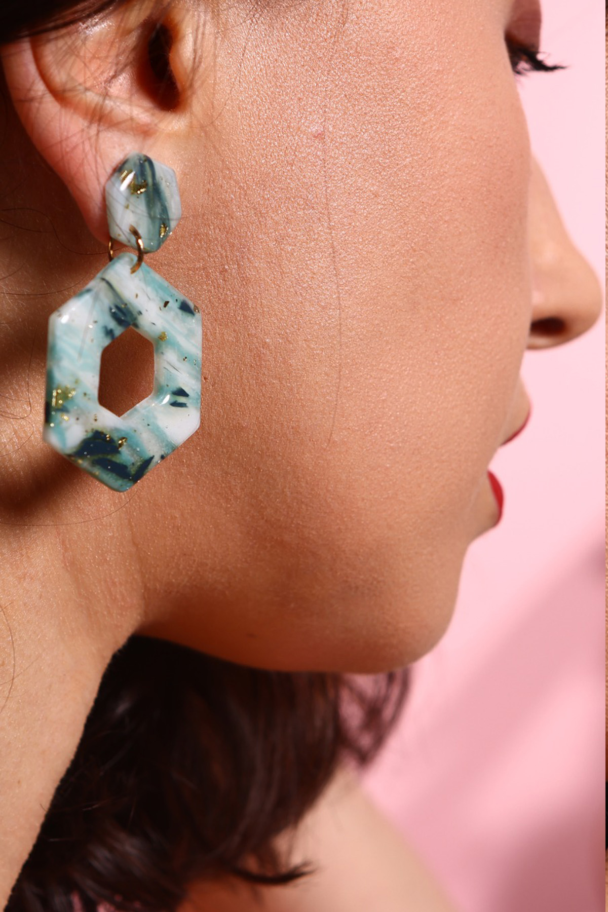 Yeşil Mermer Desenli Geometrik Kadın Küpe