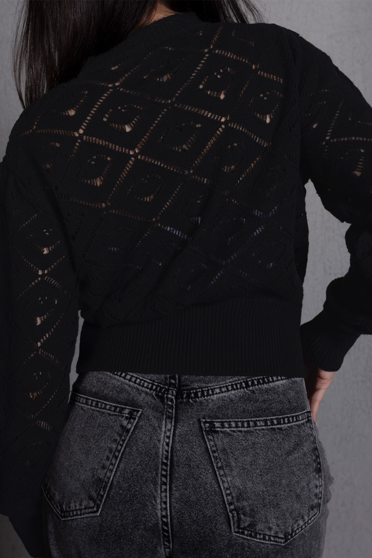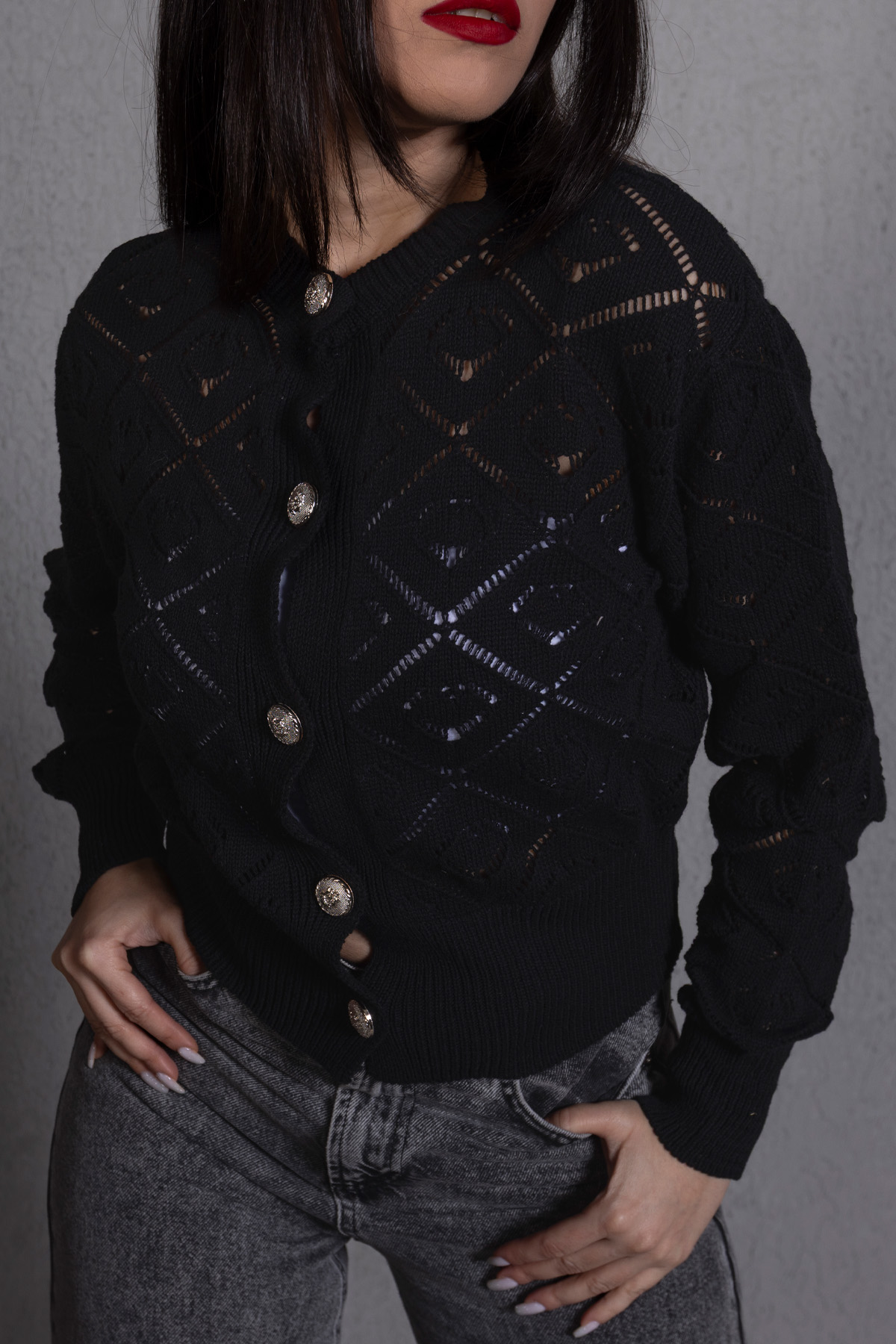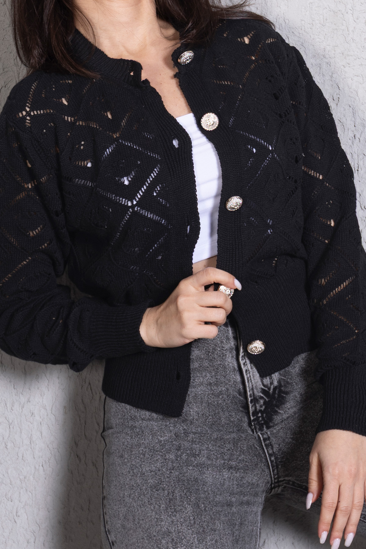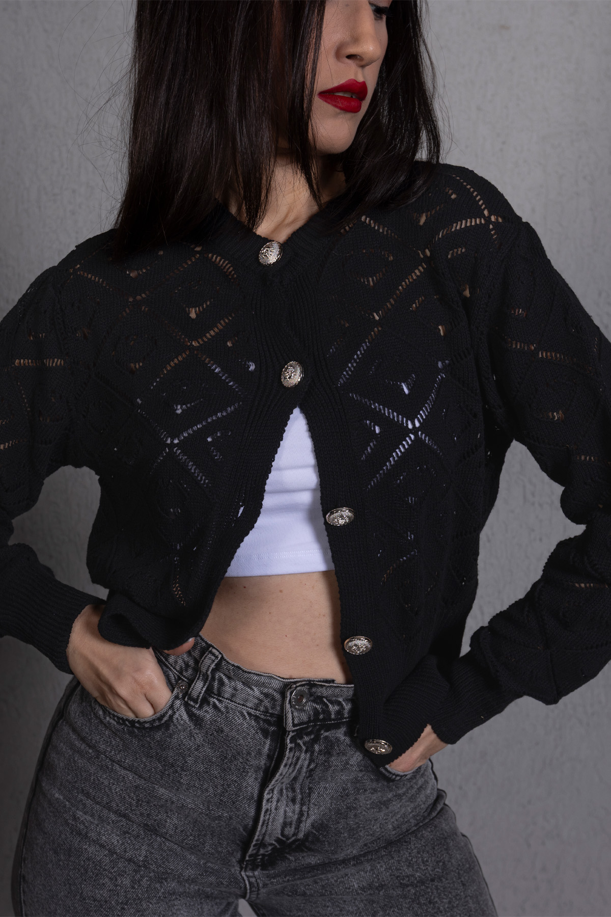 Ajurlu Baklava Desen Düğmeli Ara Boy Siyah Hırka, ajurlu dokusu ve baklava desenli yapısıyla zarif bir görünüm sunar. Ara boy