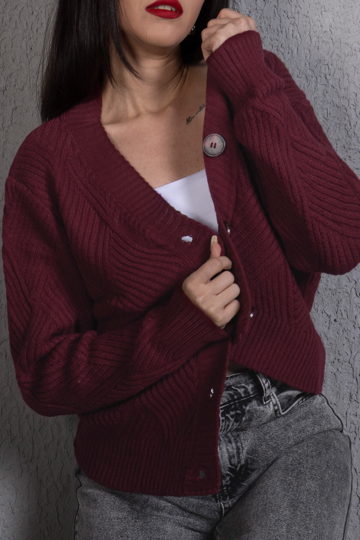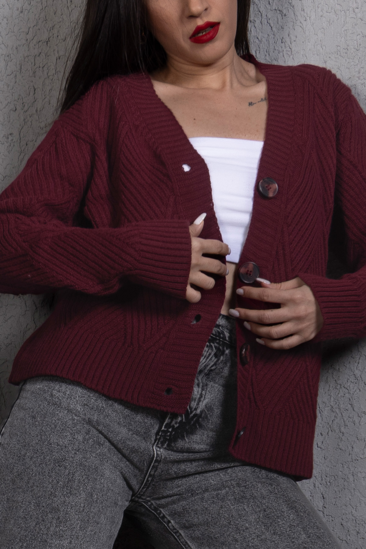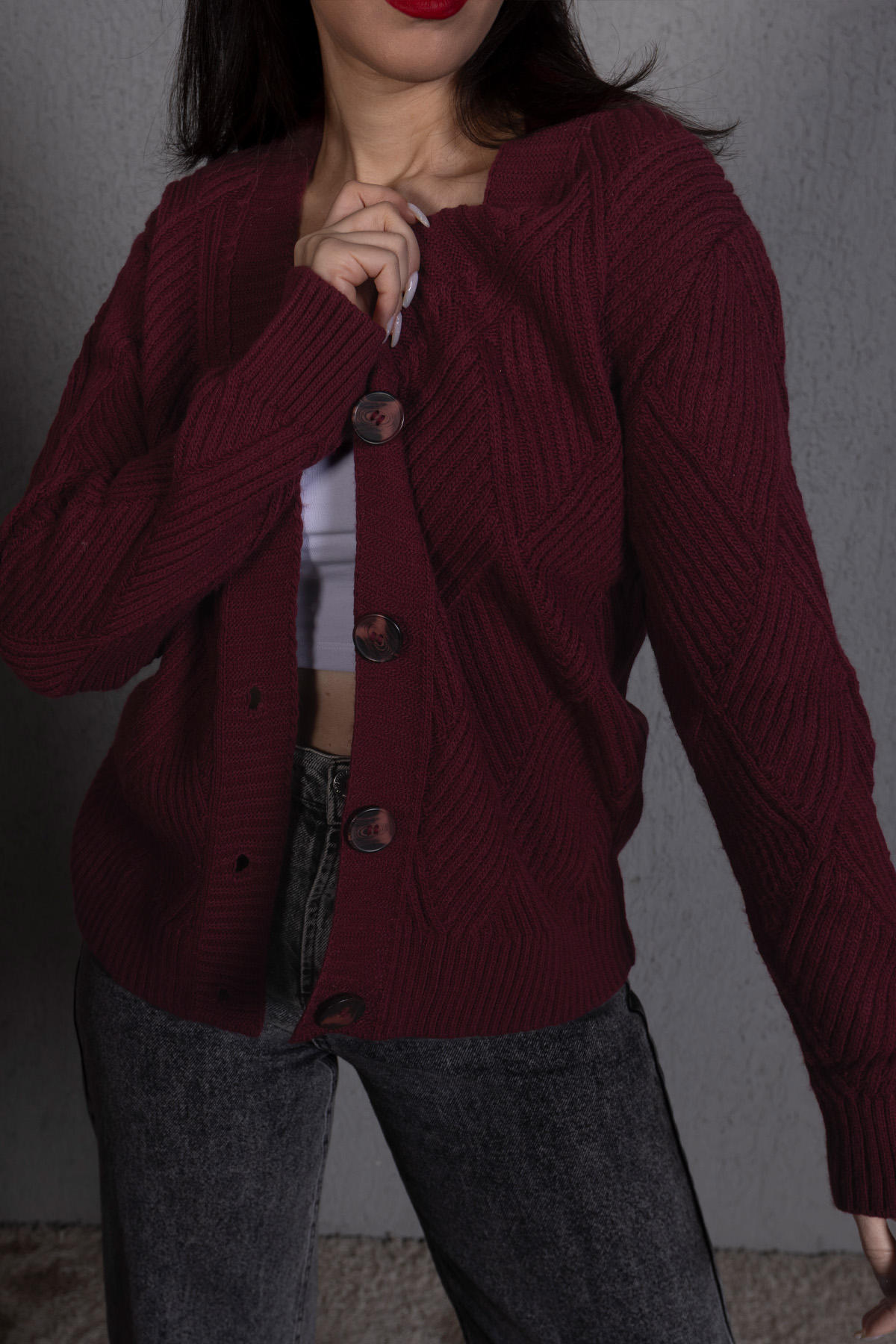 Yürütme Fitil Desenli Kadın Triko Hırka Bordo, zamansız bordo rengi ve fitil dokusuyla günlük şıklığı tamamlar. Rahat kalıbı sayesinde konforlu