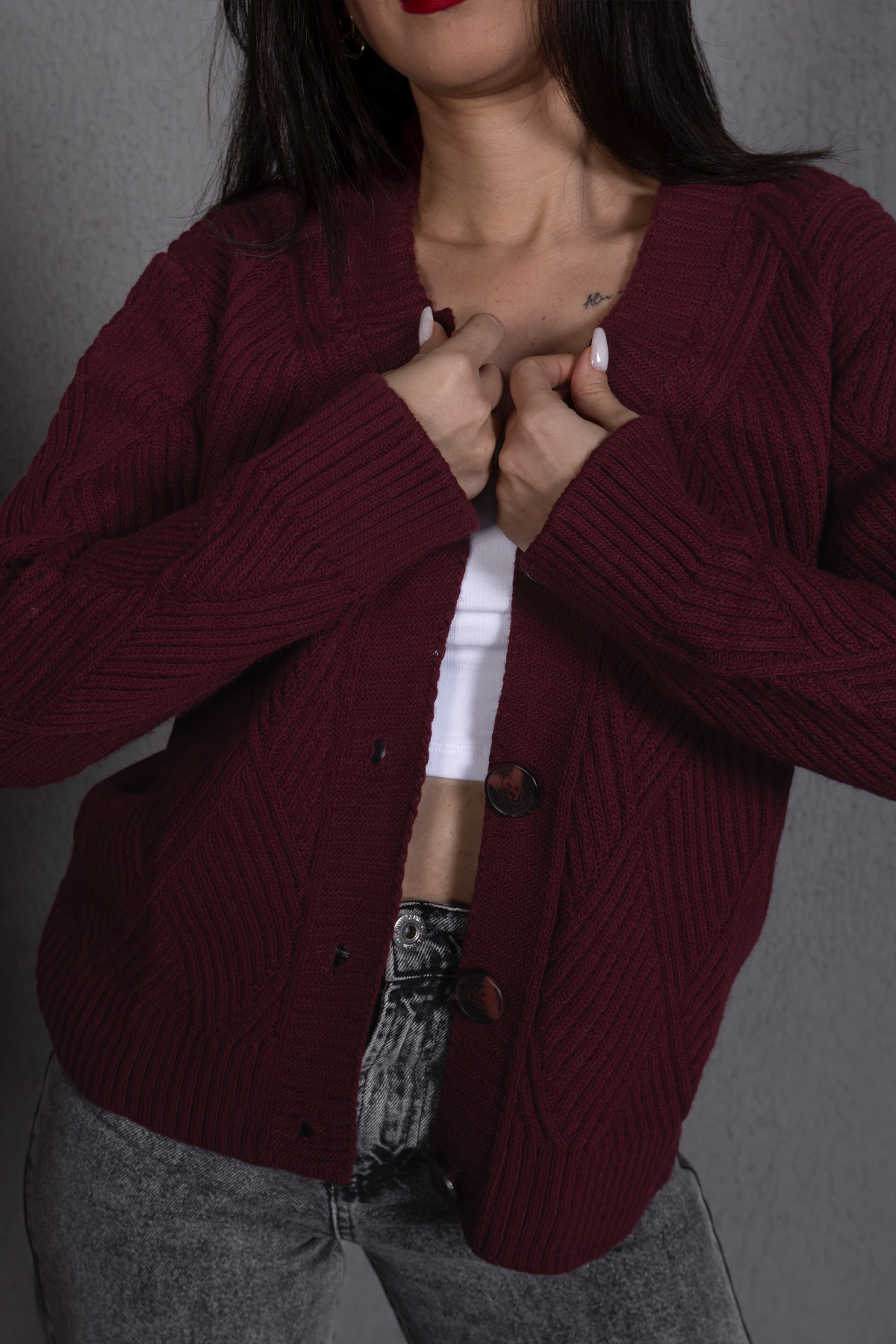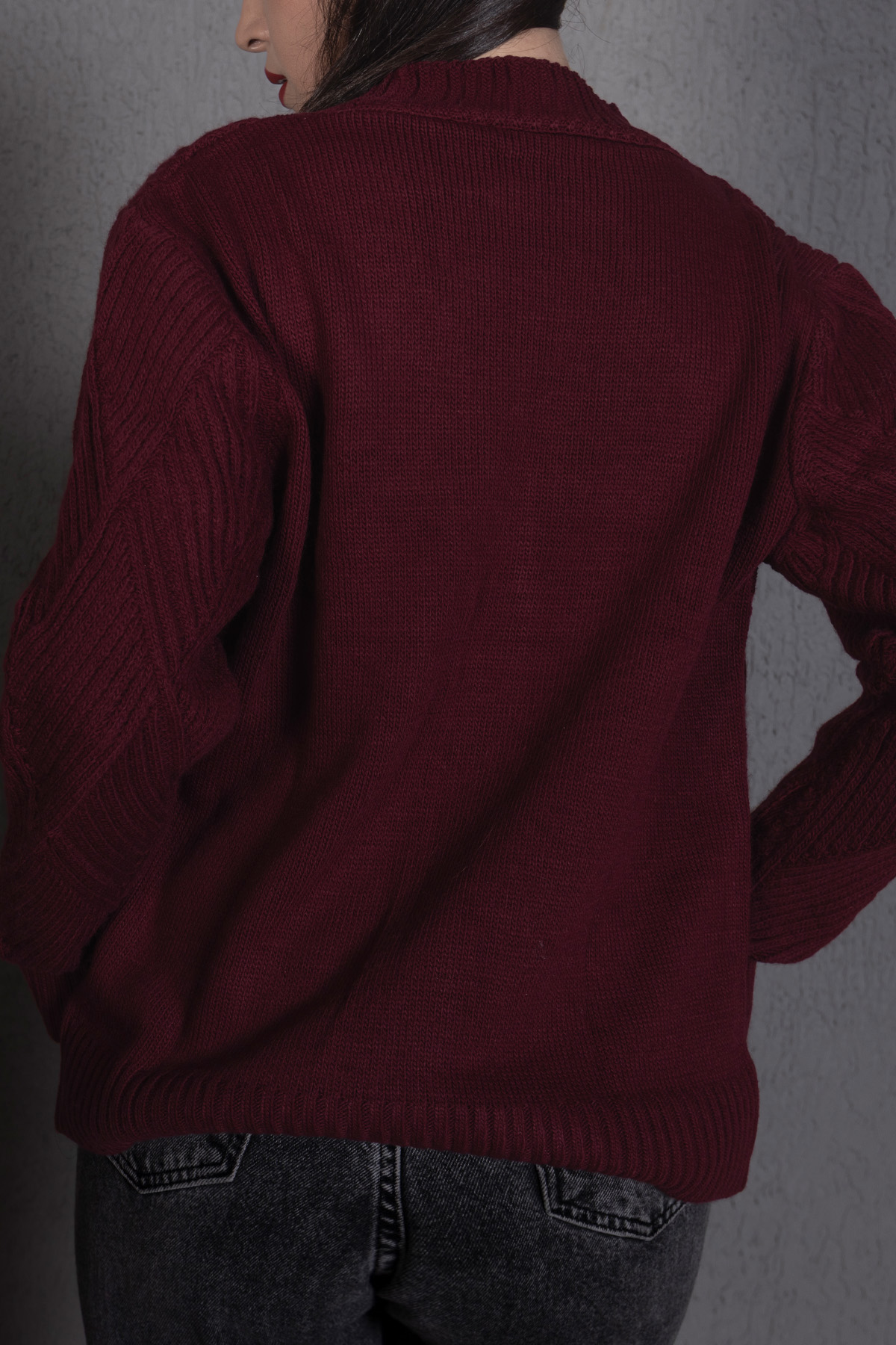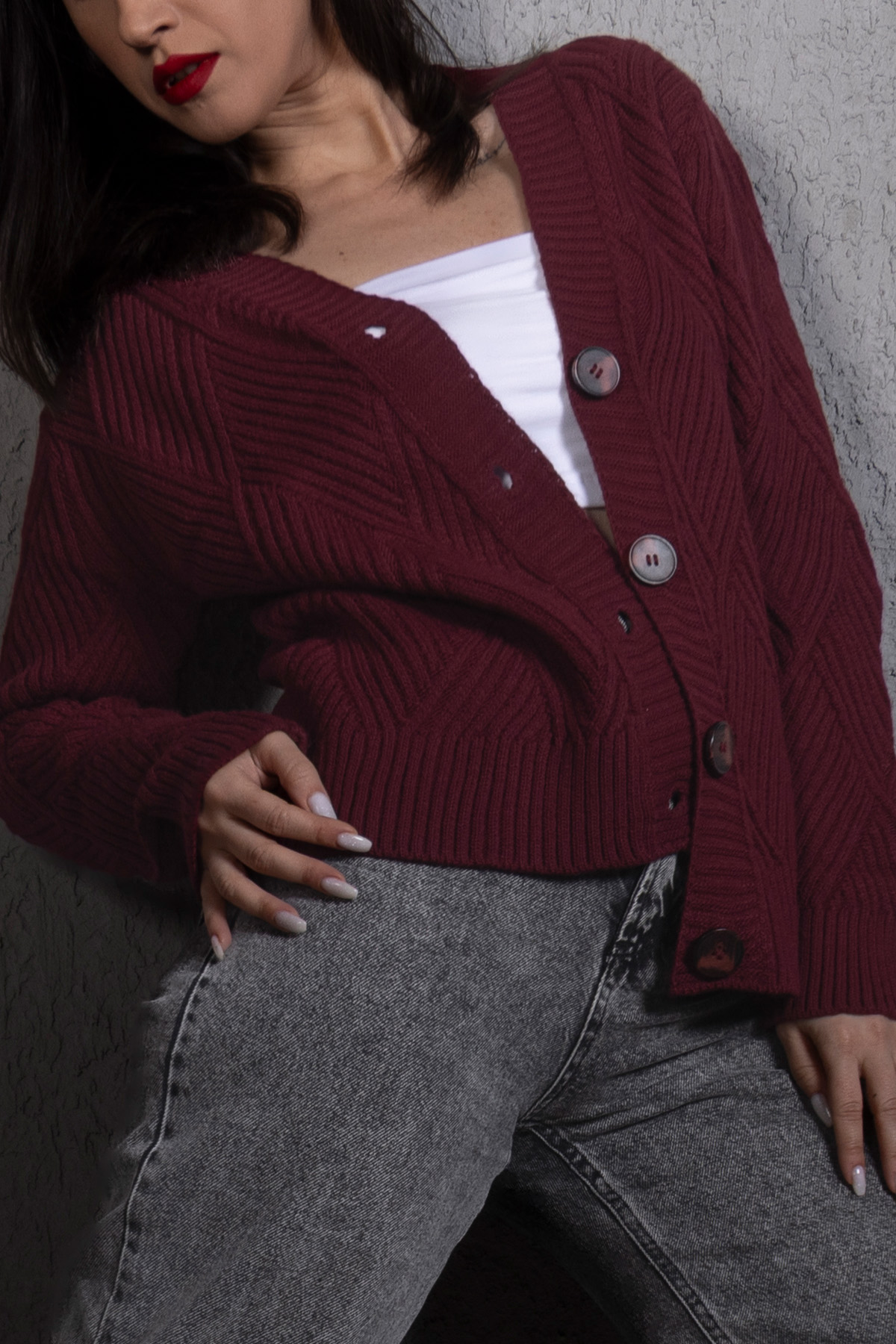 Yürütme Fitil Desenli Kadın Triko Hırka Bordo, zamansız bordo rengi ve fitil dokusuyla günlük şıklığı tamamlar. Rahat kalıbı sayesinde konforlu