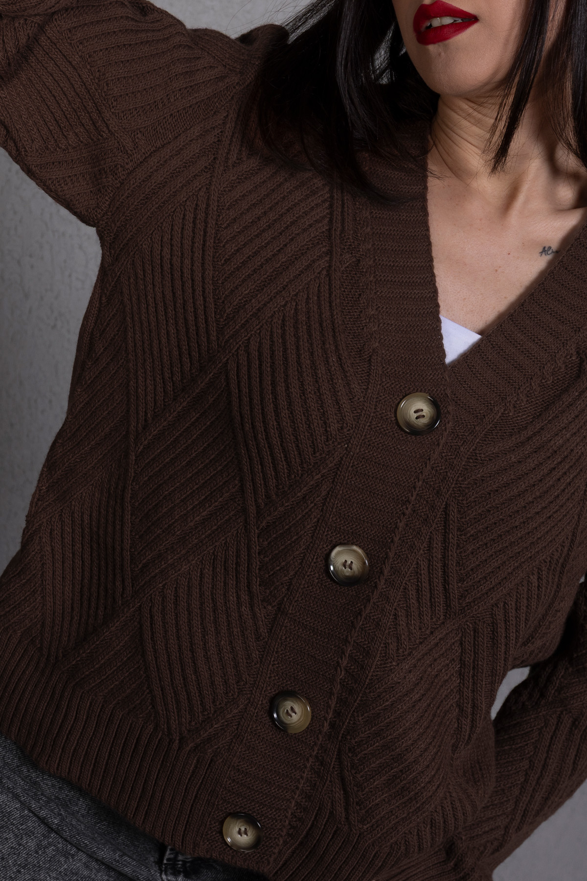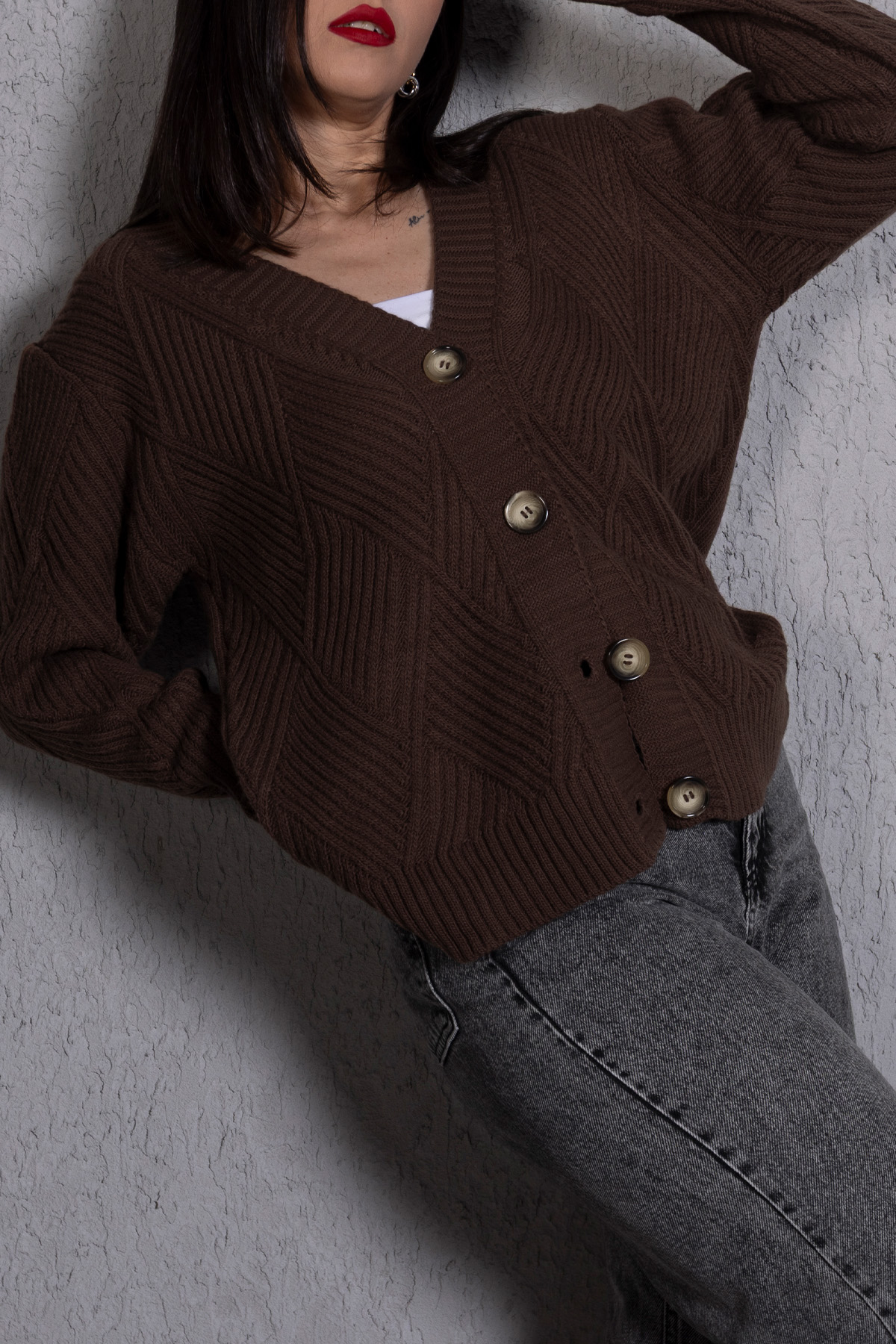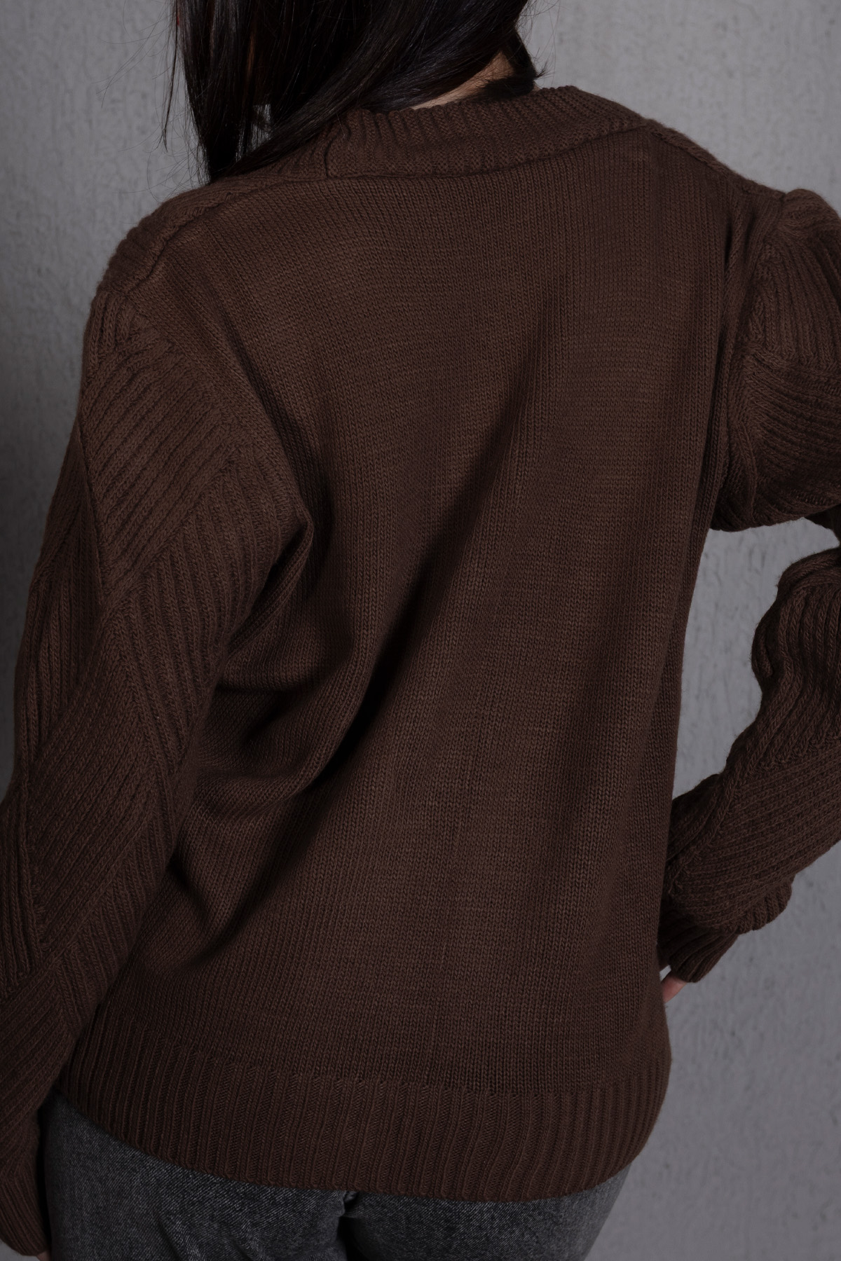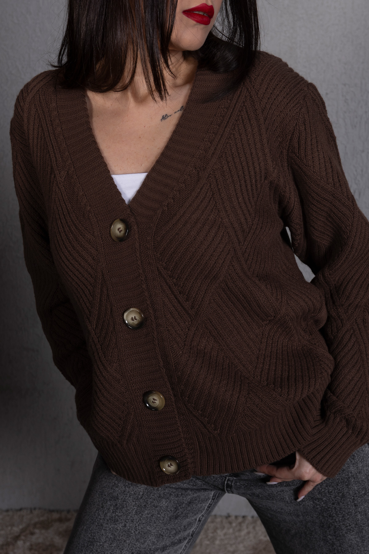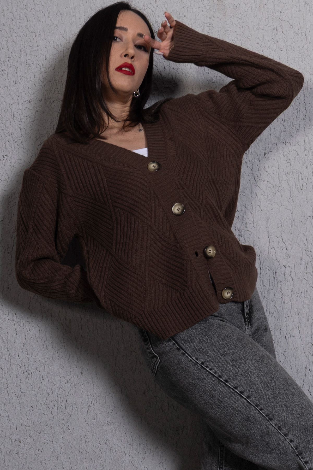 Yürütme Fitil Desenli Kadın Triko Hırka Kahve, sıcak kahve rengi ve fitil dokusuyla günlük şıklığı tamamlar. Rahat kalıbı ve yürütme