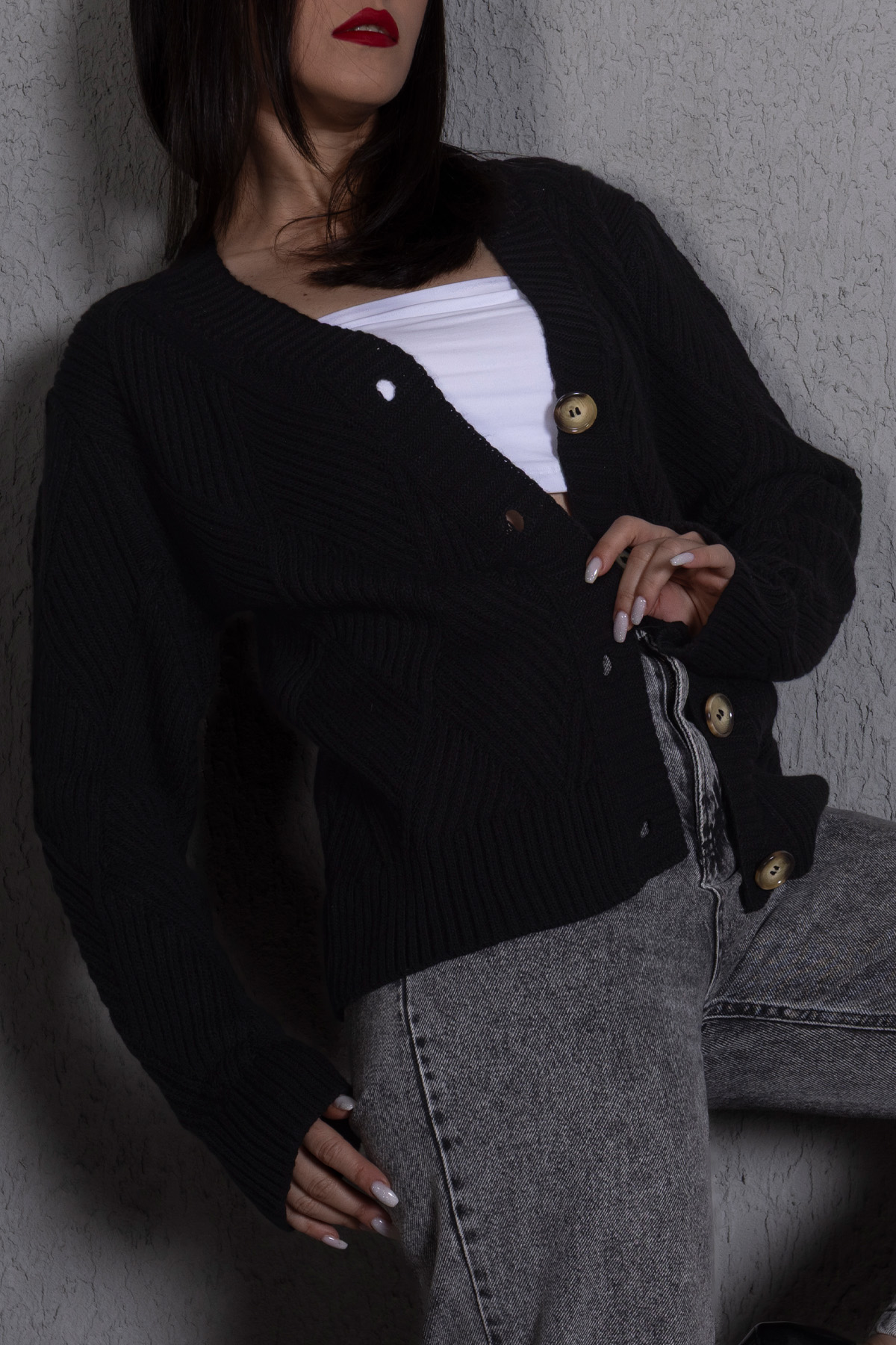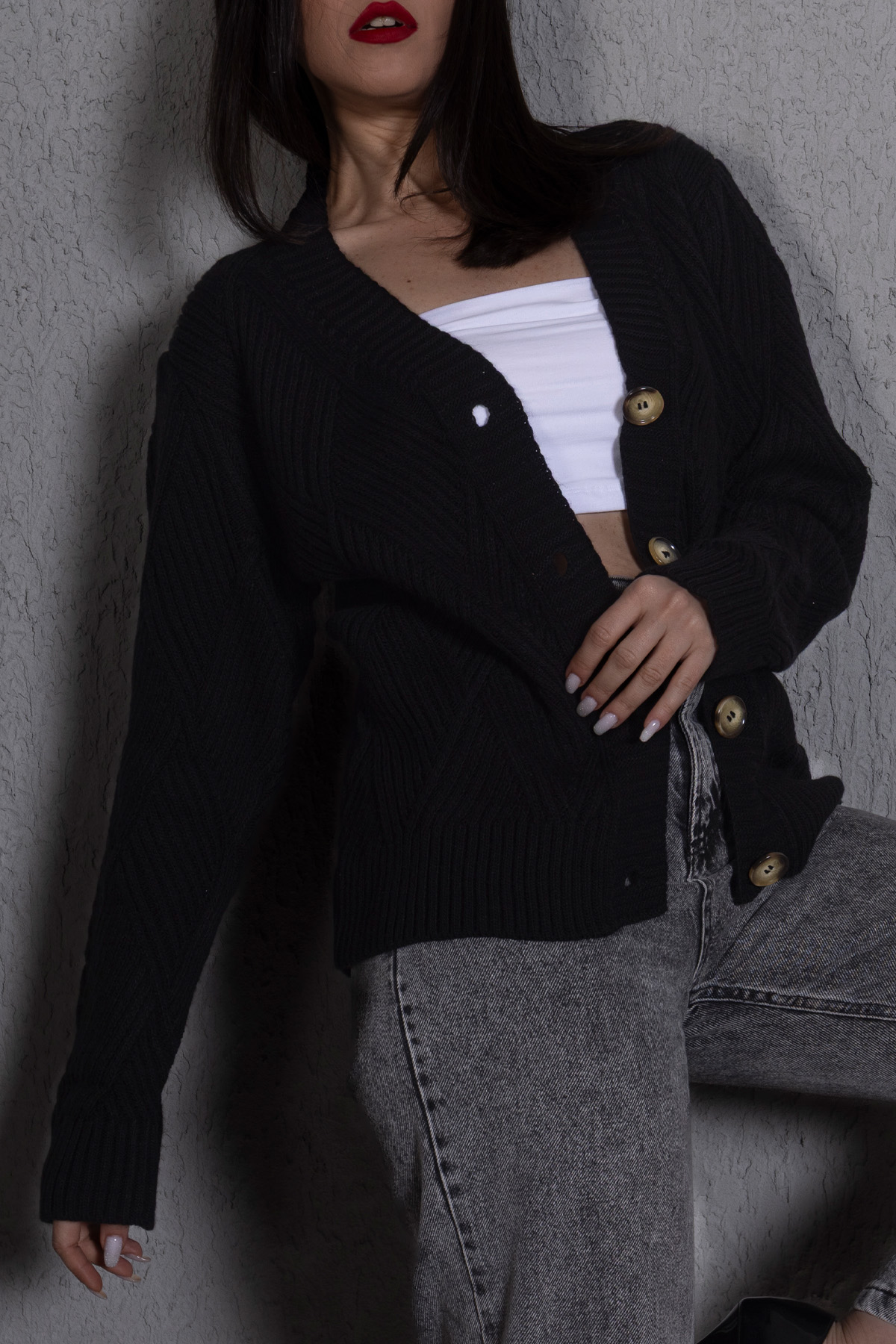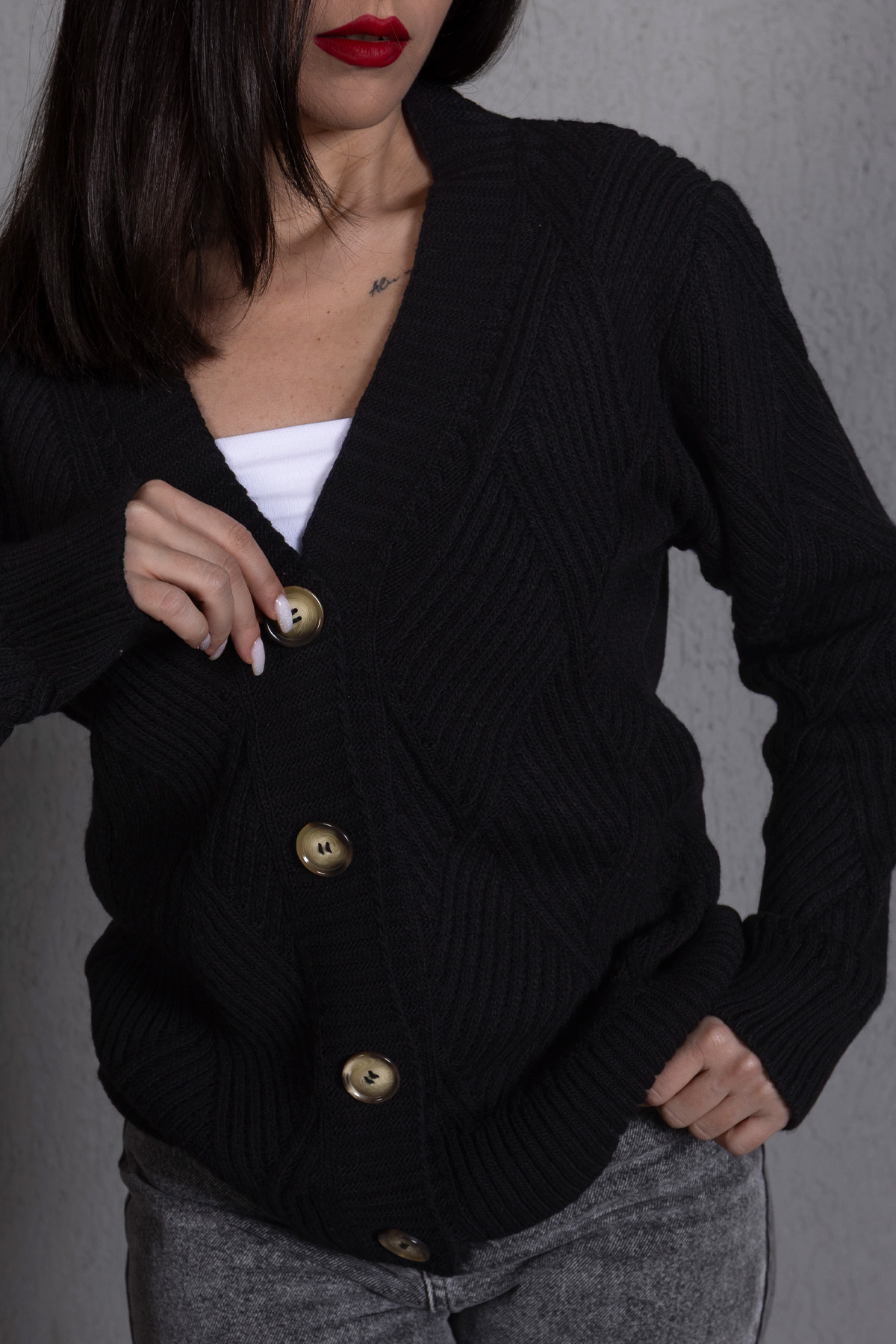 Ürün Özellikleri Renk: Siyah Model: Yürütme Desen: Fitil desen Ürün Türü: Triko hırka Kalıp: Rahat kalıp Kullanım Alanı: Günlük kullanım,