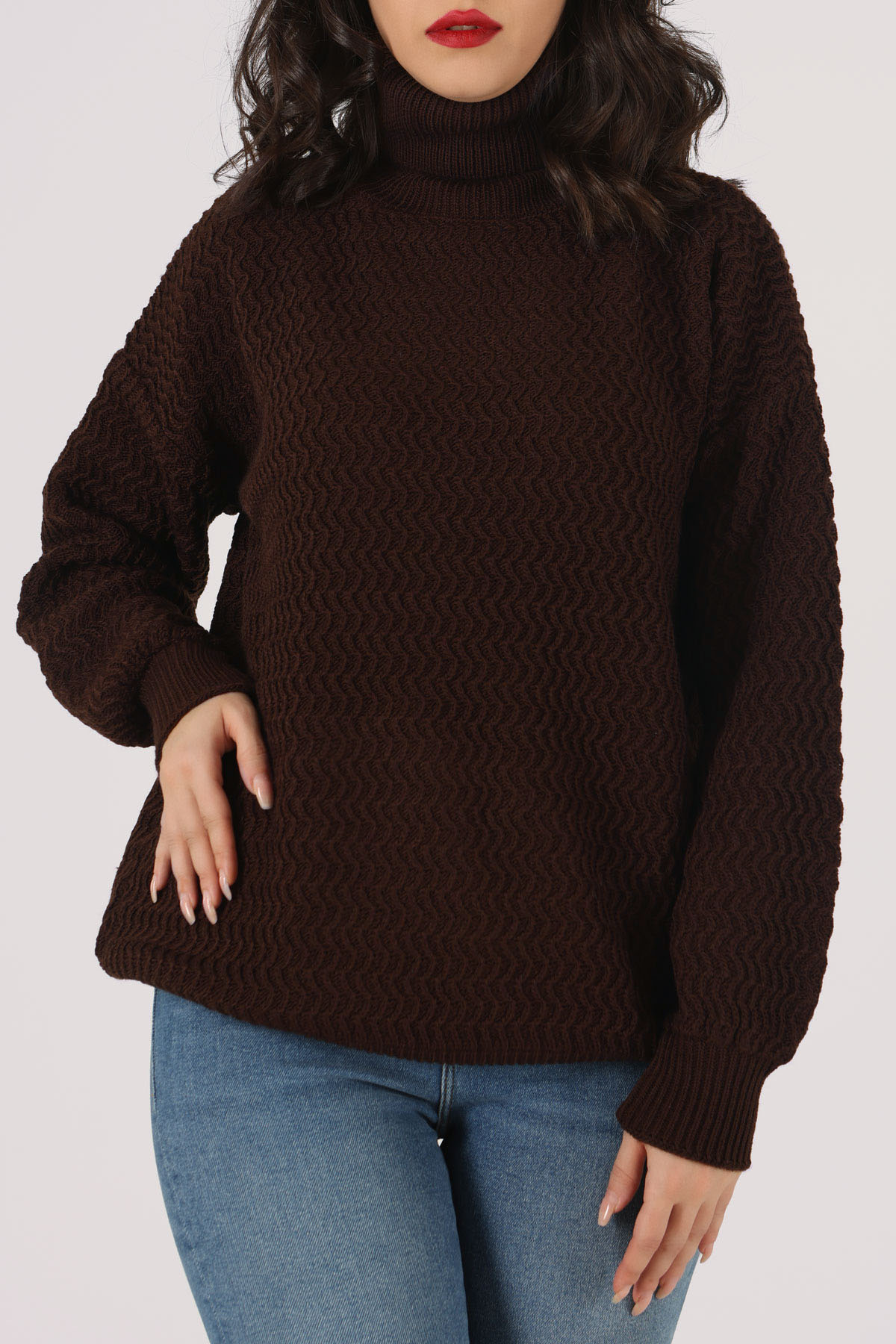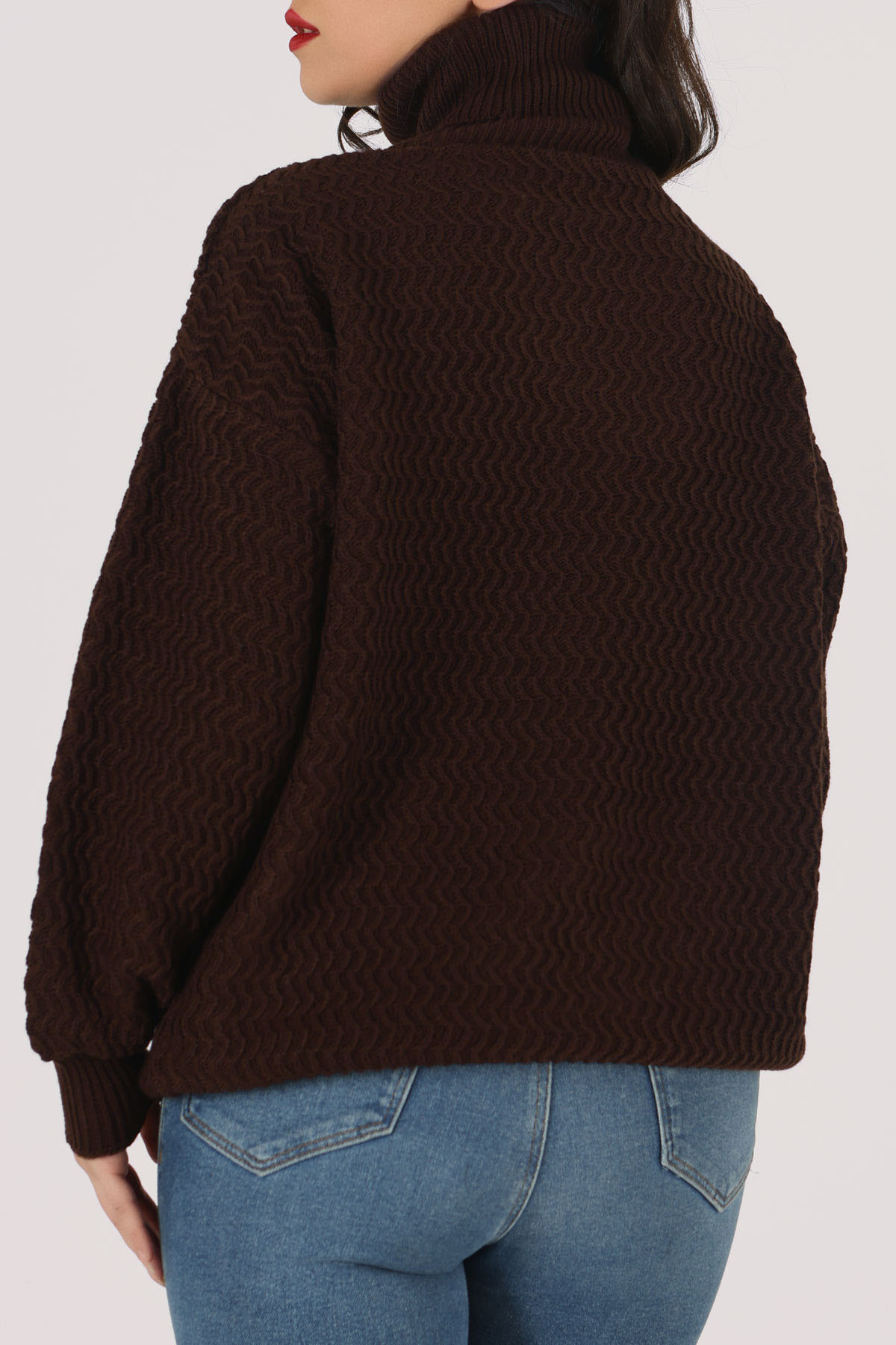 Balıkçı yaka chevron (şevron) desenli triko boğazlı kazak kahverengi, modern desen detayı ve sıcak kahverengi tonu ile günlük şıklığınızı tamamlar.